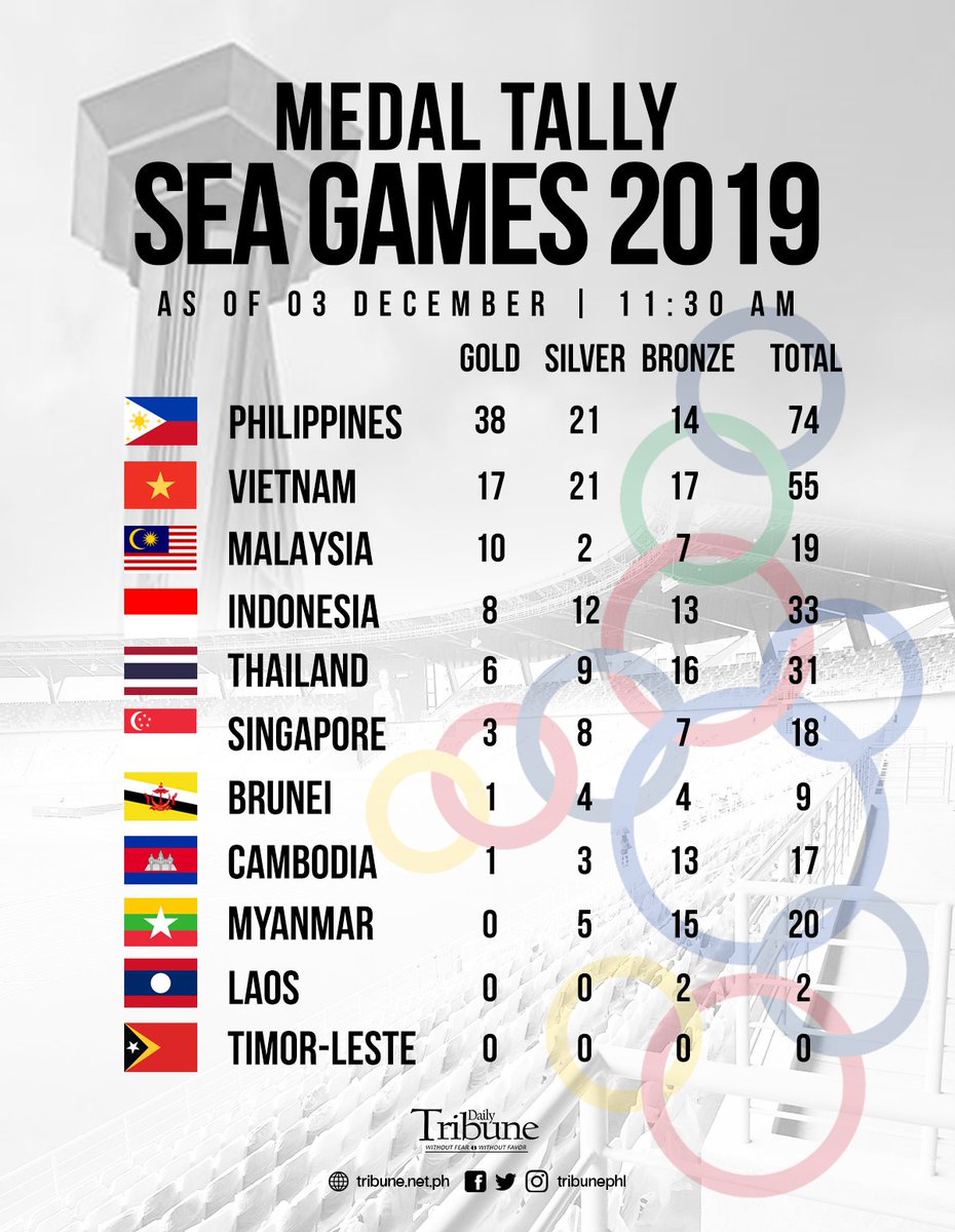 The philippines maintains the lead in the sea games 2019 overall medal tally with a total of 122 medals as of day 4. 15 of the gold medal winners across the five days of. Vietnam also maintained its rank number two with 95 medals (27 gold, 32 silver, 36 bronze) while malaysia came third with 56 (21 gold, 12 silver, and 23 bronze medals). Posted august 21, 2017 at 09:01 pm by manila standard sports. By the time the competition concluded on tuesday (10), at least 22 national records had been set and seven games records were broken.